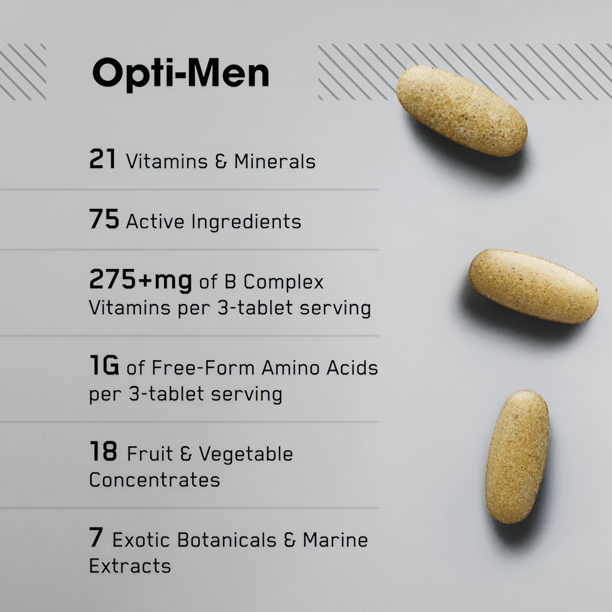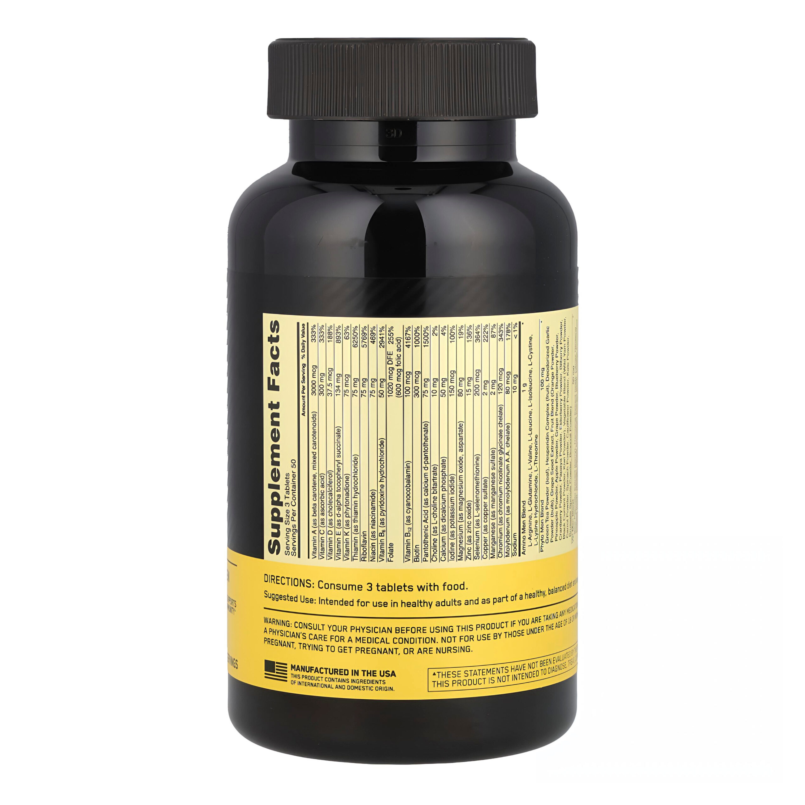 Includes 23 essential vitamins/minerals and potent botanicals (ginseng, saw palmetto).